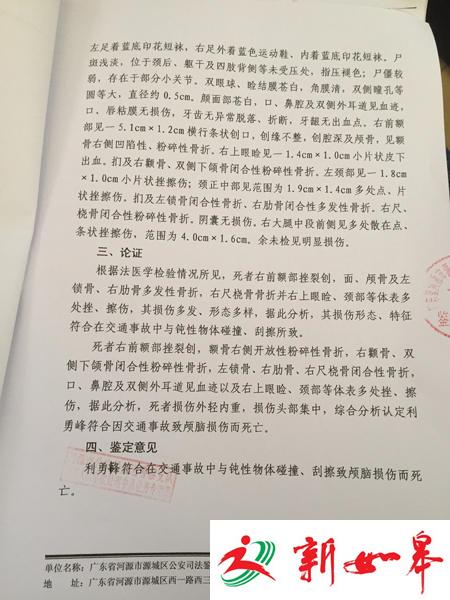 尸检结果显示,符合交通事故中与钝性物体碰撞、刮擦致颅脑损伤而死。