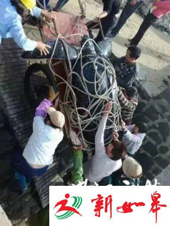 一只巨型海龟被绑在板车上,10余人才拉得动