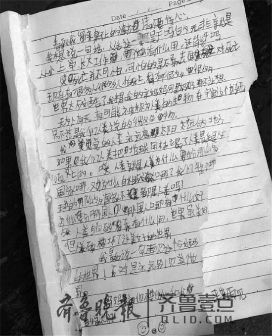 记者看到,遗书写在一个日记本上,约有300字。日记本的前几页已经撕掉,写有遗书的那一页也缺了一个角。遗书上写着“看到我留来(在)桌子上的遗书请不要伤心……”“世界太残酷了,我想我的亲妈妈……”“妈妈希望你不要伤心和我的家人们……”应该是写得非常匆忙,文章不太通顺,字迹潦草,并有多处涂改,但看过之后,孩子真实的内心表达让人非常难受。