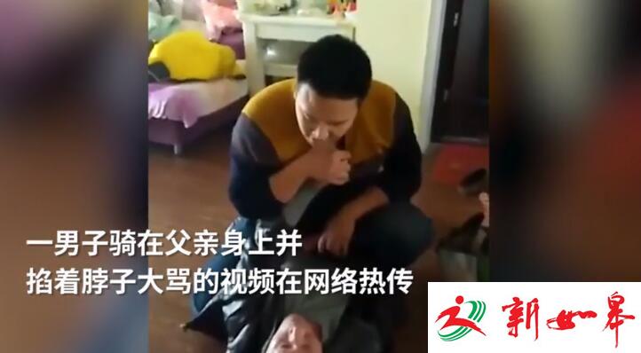 时长56秒的视频显示,一处住宅内,一名老人被按倒在地上,一名年轻男子骑在其身上,右手掐着老人脖子。视频第48秒,被按在地上的老人骂了一句脏话后,扇了骑在身上的男子一记耳光,该男子随即双手按住老人的头部。直到视频结束,该男子无明显击打动作。