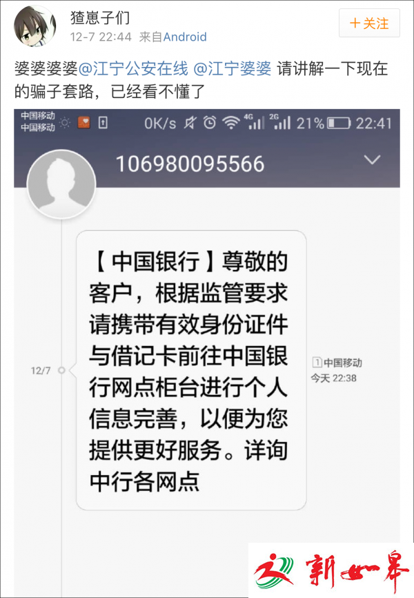 这不,网友@猹崽子们 发微博并上传短信截图求鉴定,顺手@了江宁公安在线 和@江宁婆婆。