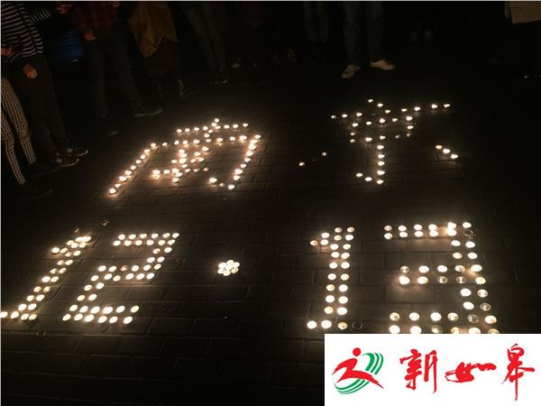 在南京东南大学九龙湖校区,晚上六点半,为了祭奠南京大屠杀遇难者并祈祷世界和平,举行了“灯光祭”和“烛光祭”相结合的祭奠仪式。随着夜幕降临,原本全黑的楼里,星星点点的亮起了灯,拼成了“1213”的字样,持续了十秒后,又变换成了“和平”二字。与此同时,在楼前的空旷地,百名学生手捧蜡烛,摆成了“1213”几个数字,静静地在这里默哀一分钟。