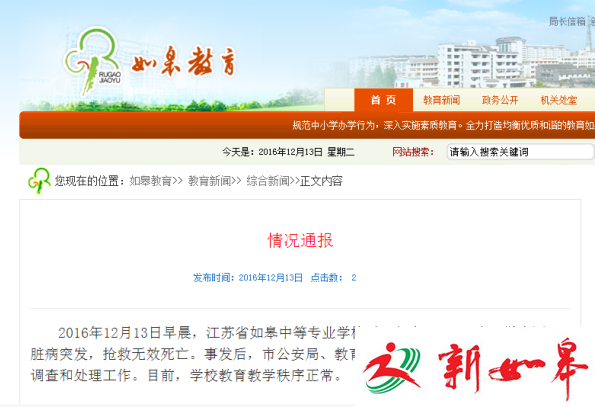 稍后,如皋教育局发布情况说明:2016年12月13日早晨,江苏省如皋中等专业学校对口部高二(5)班一学生因心脏病突发,抢救无效死亡。事发后,市公安局、教育局、如城街道第一时间介入事情调查和处理工作。目前,学校教育教学秩序正常。