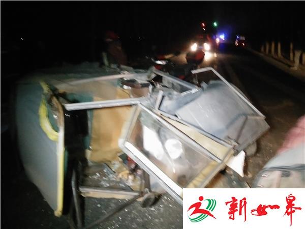 随后由西向东行驶的电动三轮车为避让行人,走右边反方向,与由东向西行驶的比亚迪相撞,三轮车被撞到后,紧接着又和后面的电瓶车追尾,使电瓶车车灯严重损坏,比亚迪轿车左前方严重脱落变形,零部件散落一地,被撞的三轮车和电瓶车挡风玻璃破碎,严重变形,侧翻在马路中间。