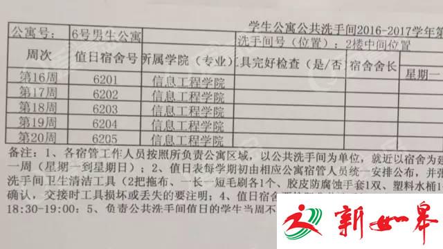 学生们告诉记者,以前他们宿舍楼里是有保洁人员和宿舍管理人员的,现在都没有了,整个宿舍楼的卫生都由各个宿舍轮流打扫,宿管人员也由辅导员轮流值班。打扫宿舍楼公共走廊和厕所区域,每个宿舍六个人或四个人负责打扫一周,每天两次,扫完以后,也是由学生干部过来检查打分。