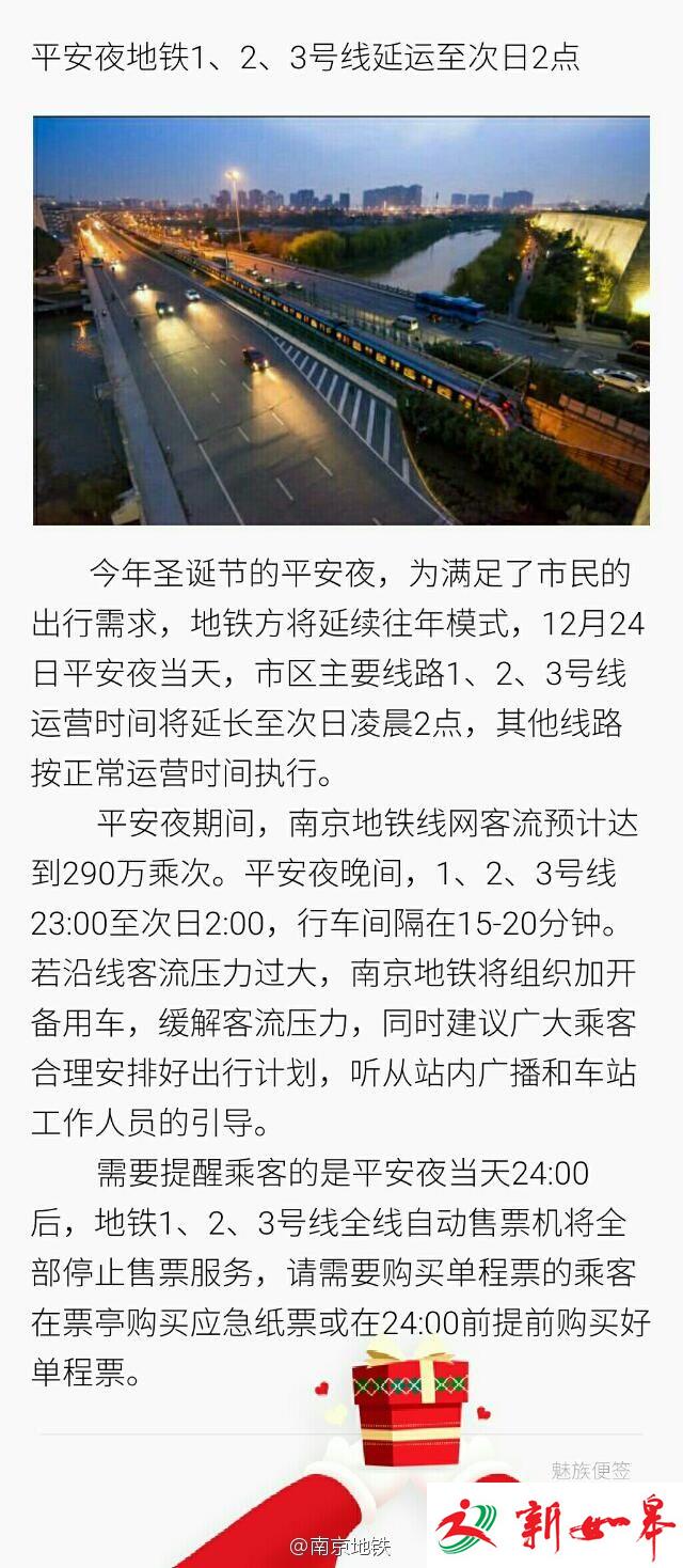 平安夜南京地铁1、2、3号线延运至次日2点