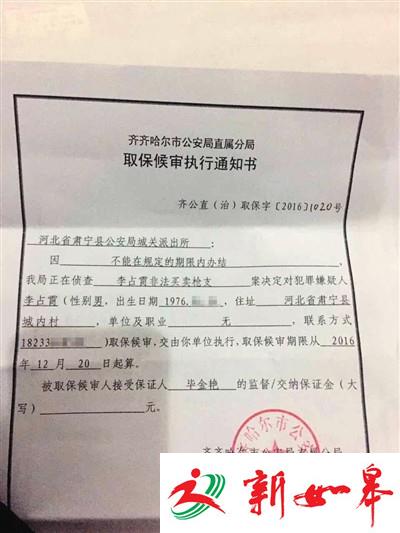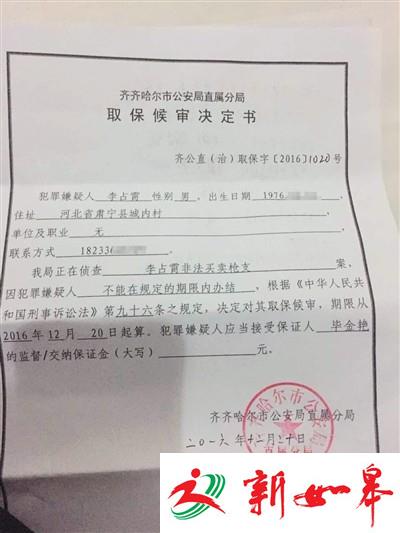 齐齐哈尔警方分别给犯罪嫌疑人李占霄(图)和河北省肃宁县公安局城关派出所出具的取保候审决定书,理由是“不能在规定的期限内办结”。本版图片/受访者供图