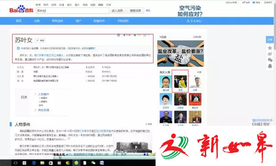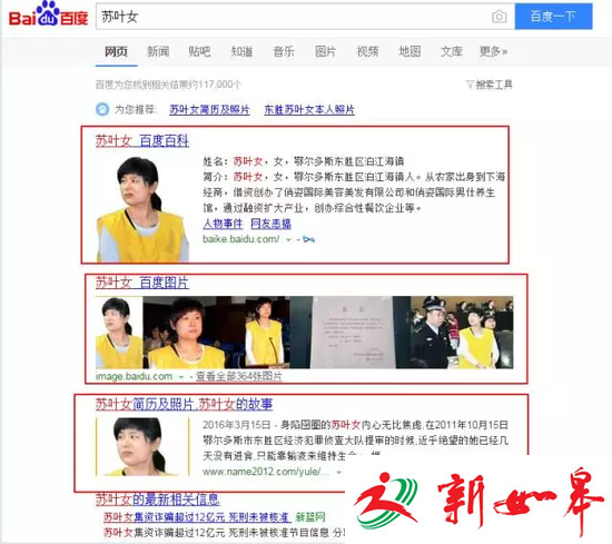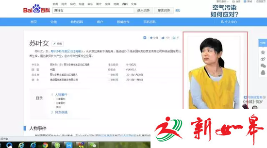 随后,记者上百度搜索苏叶女,发现“百度百科”、“百度图片”等粘贴的是吴英受审时的照片。