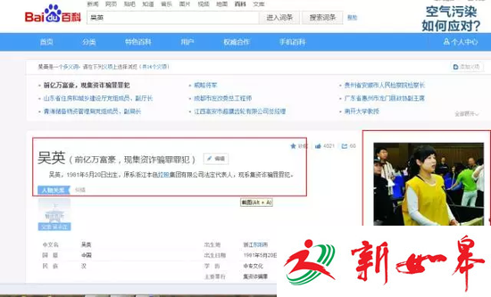 1月13日下午,曾被称为“东阳亿万富姐”、同样因集资诈骗被判死缓的吴英的代理人蔺文财向 深读记者表示,在百度查询“苏叶女”时,发现“百度百科”、“百度图片”、“苏叶女简历及照片,苏叶女的故事”中粘贴的均是吴英的照片。