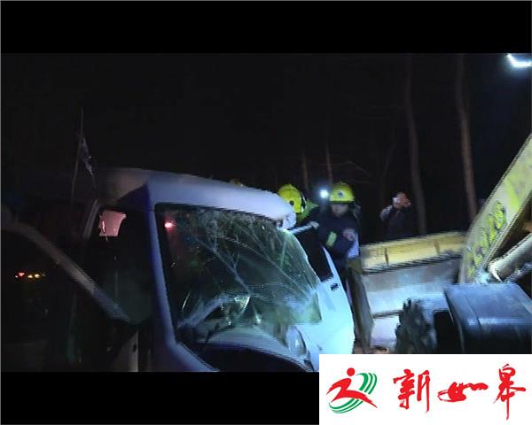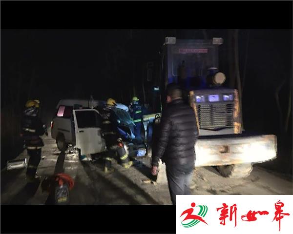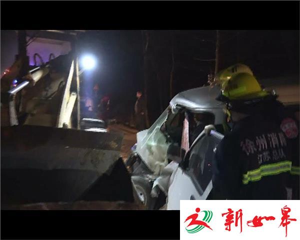 1月10日18时17分,位于徐州市新沂高流镇高时路高二段一辆面包车撞上了一辆铲车,面包车司机被困车内。接到报警后新沂中队立即出动1辆抢险救援车6名消防官兵赶赴现场救援。