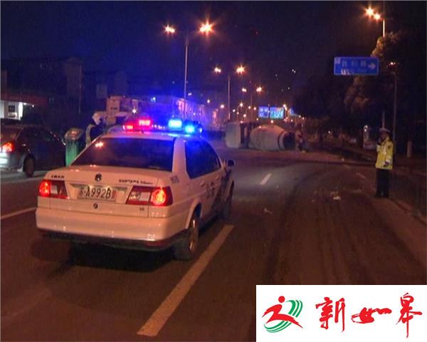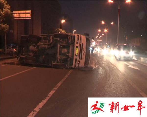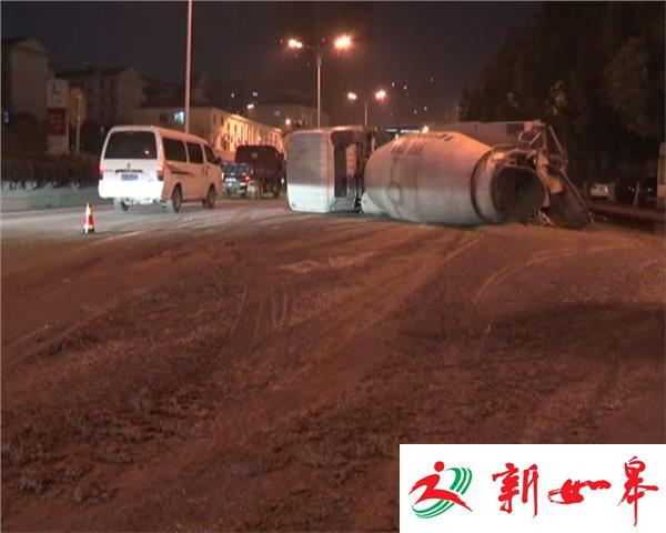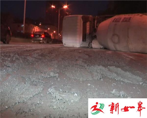 搅拌车爆胎后急刹 车辆侧翻混凝土洒了一地