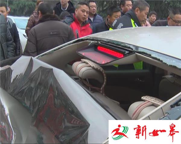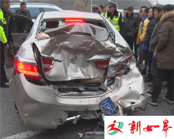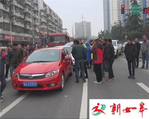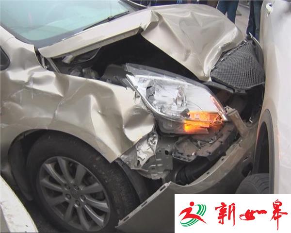 记者赶到现场时,多辆轿车横在路中央,被撞的小轿车司机告诉记者,当时他们都是在幕府西路下桥口等红灯,这时一辆满载热水的送水车突然撞上了别克轿车,别克轿车又撞上了前面的三辆轿车,别克轿车被前后挤压变成一厢车,车上一女士头部被撞击受伤,其它轿车不同程度受损。送水车司机称由于自己的车太重,刹车失灵才撞上了前面的轿车,造成由东向西方向,路堵到了五塘广场。