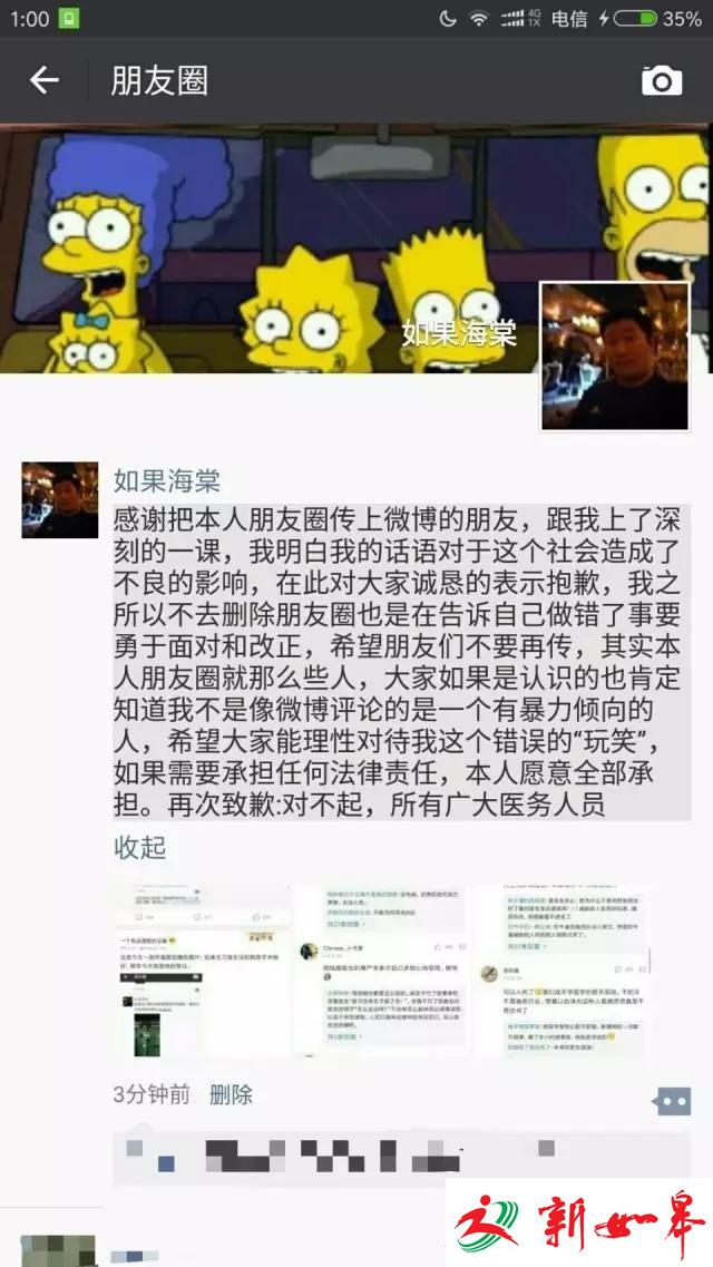 面对网络上铺天盖地的谴责,“杀医”文字发布者在朋友圈发文称:“我哥只是简单的骨科手术,不会死人也不会落下大病。本人发图只是希望得到各位亲友的关注,并且对我哥手术后多点关心和鼓励,并无他意。”