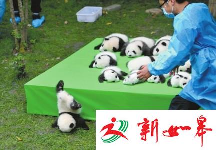 绿色地毯铺成的舞台上,23只熊猫宝宝集体亮相,活泼的“滚滚”们四处爬,其中一只不慎摔下舞台,饲养员赶忙上前抱起……生动的一幕被摄影师定格。