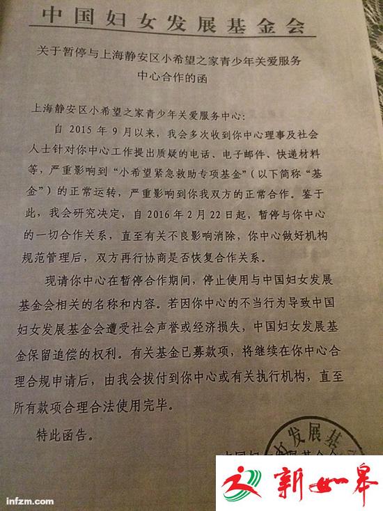 2016年2月22日,受到理事及社会人士多次投诉质疑的压力,中国妇女发展基金会发函暂停与小希望之家的一切合作关系。据了解,小希望之家于2014年12月15日和中国妇女发展基金会(以下简称妇基会)签订“小希望紧急救助专项基金”合作协议,时间为5年。