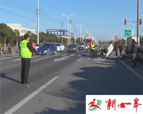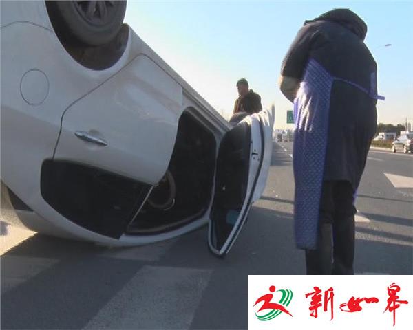 近日,一辆蓝色轿车行驶到宁通公路六合灵岩段十字路口,停车等信号灯时,后面一辆银白色轿车突然撞上来,将等红灯的蓝色轿车撞飞。银白色轿车180度大旋转,然后四轮朝天,司机被困在驾驶室,路人发现立即将其救了出来,所幸并无大碍。
