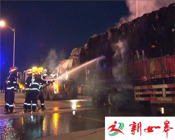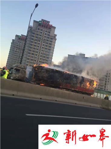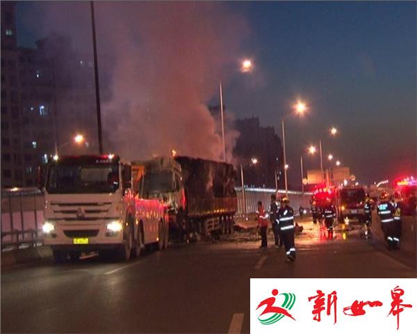 1月20日下午5点钟左右,在南京浦口江北大道快速路,服装城段高架桥上,一辆由合肥开往扬州,运载废纸盒的南京牌号的半挂货车,在行驶中忽然起火。驾驶员黄某讲,是后面车辆给他按喇叭,他从后视镜中发现的,立即停车报警,浦口警方和消防接到报警后,立即赶到现场。现场看到浓烟滚滚火势很大,兴浦路消防中队和珠江消防中队,共六辆消防车现场灭火,由于运载的是有三十多吨纸箱,又是下班晚高峰时间,烧了两个多小时,火还没有完全被扑灭,最后警方决定先灭掉明火,用拖车把货车拖至桥下空旷地段再处理。事故造成路堵三公里左右。
