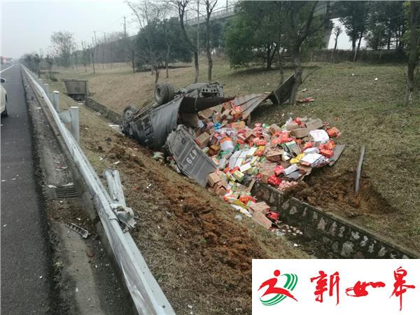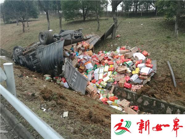 在现场可以看到,整辆车都翻到高速路基的排水沟里,车子底朝天,车上运输的都是超市准备上柜的各种年货食品。