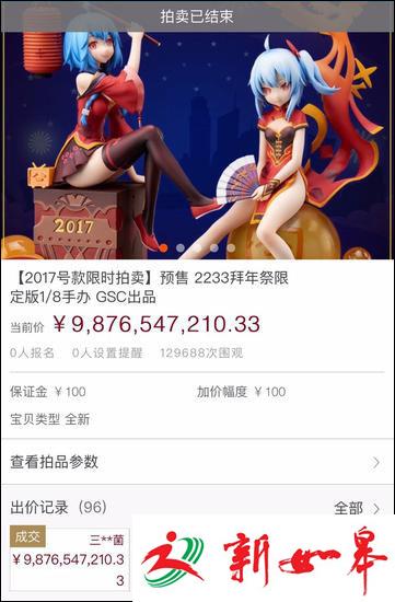 拍卖会于1月23日晚7:30开始,第2017号2233娘手办拍了1个多小时,竞拍价也一路飙升到几十倍,最终锁定在98亿元人民币。
