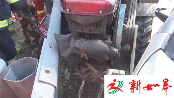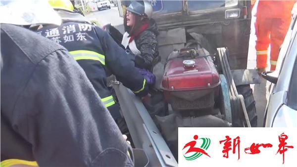 事故是由于一辆四轮电动车撞上了拖拉机,随后拖拉机车头又撞上电瓶车,导致电瓶车车主下半身被卡在路边护栏里,动弹不得。了解情况后,救援人员先稳住女子上半身,同时安慰车主情绪,其余救援人员合力将拖拉机移走。女子获救后,被抬至担架由120送往医院。