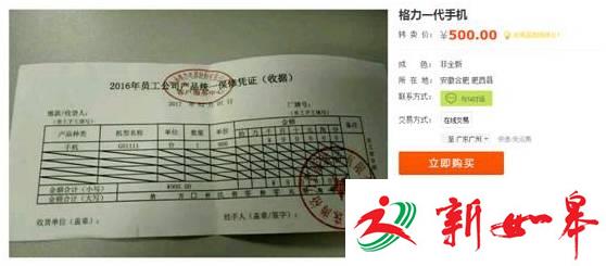 该名卖家将价值900元的格力手机1代以500元的价格转出。对于公司发放的保修凭证,他告诉记者,“保修凭证是公司统一发的,就是(将产品)带出生活区及公司的一个凭证而已。”