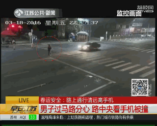 智能手机的普及让很多人变成了“低头族”,春节期间抢红包的游戏也让越来越多的人放不下手机。不过,不管是行人还是驾驶员,在路上通行的时候可千万别沉迷手机,否则后果会十分严重。