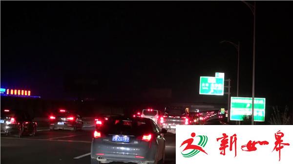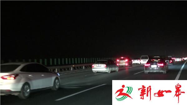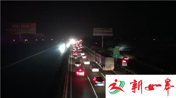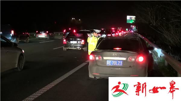 当晚民警在G15沈海高速上巡逻看到路上的车辆是一辆接一辆,如驾驶员稍不留神就能引发事故,盐城高速一大队民警拉响警笛和用话筒不断的提醌驾驶员减速慢行保持车距保证行车安全,在重要堵车路段民警下车指挥和引导车辆通行。