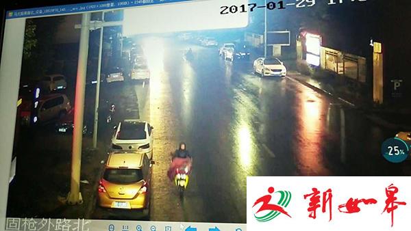 监控显示,肇事女子着黑色羽绒服,骑绿色电动车,车前罩着玫红色雨披。