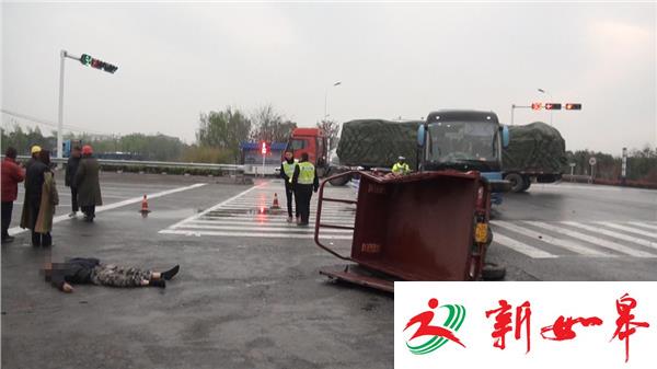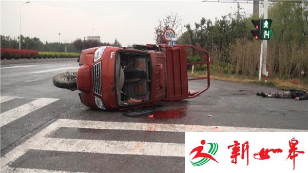 记者赶到现场时,摩托车上受伤的一名驾乘人员已被120救护车接送到医院抢救,事故处理民警正在对现场进行勘查,在十字路口的西北角,一名中年男子仰面躺在路边上,已经没有了生命迹象,一辆正三轮摩托车头朝东侧翻在旁边,驾驶室的挡风玻璃破碎,整个车身左侧的挡板因受到撞击而凹陷变形,地面上有一大滩血迹,东侧不远处,一辆大巴车头朝西停在十字路口的中央,前保险杠弯曲,前挡风玻璃呈网格状破碎。大巴车驾驶员告诉记者,当时路口的红绿灯呈黄闪灯状态,他是由东向西行驶的,车速在四十码左右,三轮摩托车是由南向北行驶的,车速比较快,等他发现摩托车时,已经来不及采取避让措施,结果就发生了碰撞,双方都不存在闯红灯通行的违法行为。