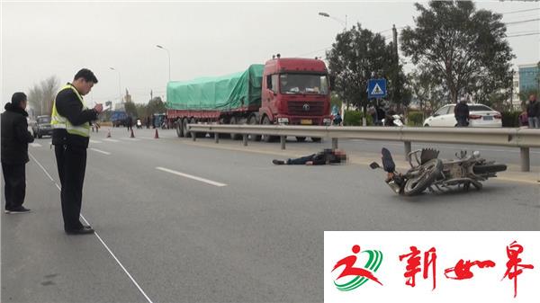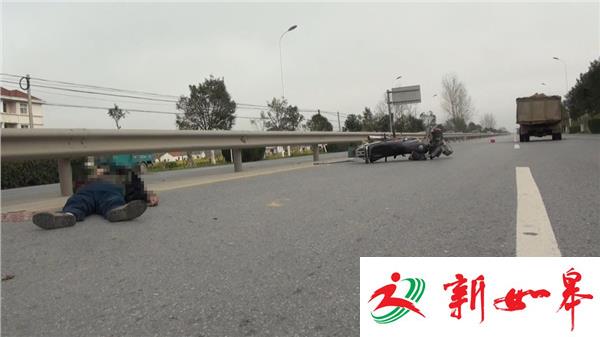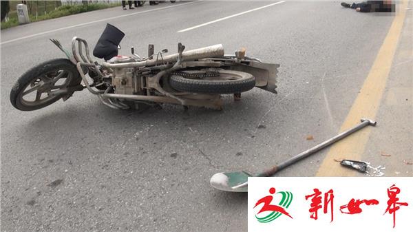 由于事故现场占据了省道226线由南向北的两股车道,事故处理交警已经将整个方向的车道进行封闭,由南向北车辆借道通行,现场没有滞留积压车辆。记者在现场了解到,这是一个没有红绿灯控制的T型路口,受伤的摩托车驾驶员已被120救护车接送到医院救治,一名老年男子仰面横躺在由南向北的快车道里,地面上有一大滩血迹,旁边的隔离护栏上也有喷溅的血迹,已经没有了生命迹象,北侧不远处,一辆架子摩托车侧倒在车道里,反光镜脱落,塑料挡板破碎,在北侧十多米远的地方,一辆农用车头朝北停在行车道里,旁边的快车道里还有一顶粉红颜色的安全头盔。据农用车驾驶员讲,他是由南向北在省道226线上正常行驶的,而摩托车则是沿盘龙大道由西向东左拐弯的,可能是摩托车的速度比较快,在拐弯时避让不及,就一头撞到农用车的左后轮胎上了。