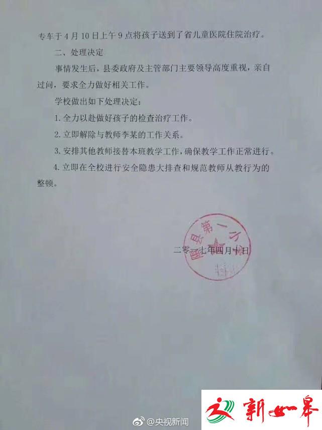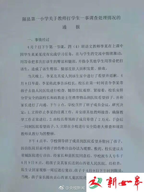 近日,山西隰县第一小学,因未完成学习任务,语文教师李某用扫帚把多次打一学生臀部和腿部,并指令其他学生继续打,导致被体罚学生腿部、臀部皮肤大面积发紫淤血。目前,该教师已被校方解聘,学校筹借2万元为受伤学生治疗。(央视记者崔肖冉 宋振兴)