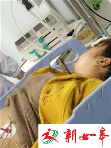 记者在扬州苏北医院接诊看到,受伤孕妇正在躺在急救床上,呼吸正常,面部有血迹,一截大拇指粗的树棍戳进脖子部位,鲜血溢出。