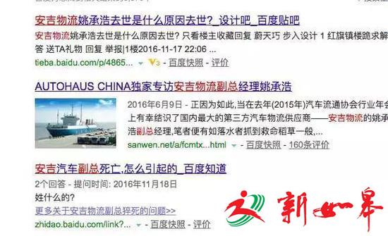 转眼间,一个多月过去了,记者几乎都快忘了举报信一事。3月底,一个偶然的机会,记者在网上看到了两条关于举报信中提及的安吉物流副总姚某浩猝死的信息,时间为2016年11月17和18日。但除此之外,便无更多有效信息。