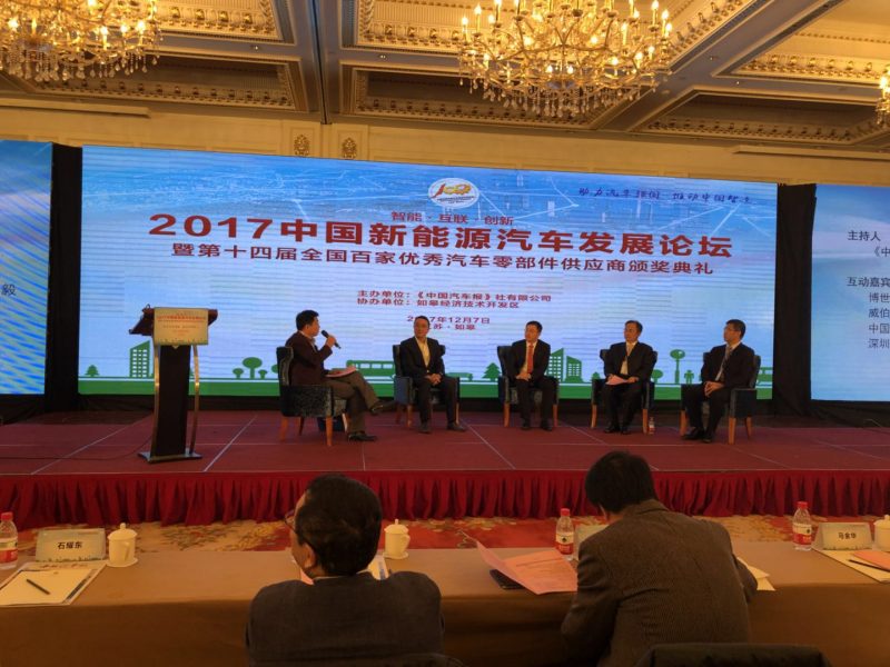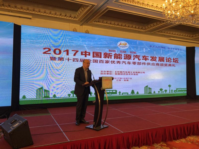 12月7日,由《中国汽车报》社主办、如皋经济技术开发区协办的“2017年中国新能源汽车发展论坛暨第十四届全国百家优秀汽车零部件供应商颁奖典礼”在江苏如皋举行。中国机械工业联合会执行副会长陈斌,国务院发展研究中心产业经济研究部副部长石耀东,国家信息中心信息化和产业发展部制造业信息处处长李伟利,中国能源汽车传播集团董事长、《中国汽车报》社社长何伟,中共如皋市委常委、如皋经济技术开发区党工委副书记马金华等来自国内行业专家、政府领导及100多家一级零部件供应商前来参会。