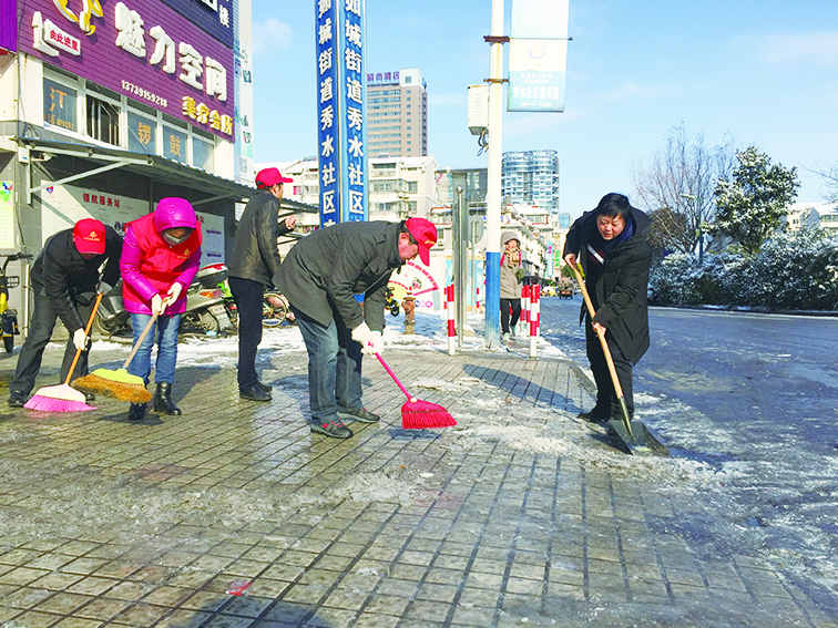 “各小区的出入口每天的人流量可不小,而且有的出入口有坡度,一旦积雪,车辆就极容易打滑,很危险。只有扫干净了才放心。”秀水社区党总支书记储湘君一铲一铲地把雪和冰推到路的两旁,遇到铲不动的,索性就徒手清理。尽管寒风吹红了脸颊,冻僵了双手,但她心里觉得特别温暖:“能为他人出行贡献力量,累点儿也值!”雪中情暖人心。虽然温度极低,但是人行道上、乡间小道、背街小巷、居民庭院,处处可见一支支自发的清雪党员志愿大军,奋战在大风雪中。他们挥锹抡帚,用自己的行动践行了“奉献、友爱、互助、进步”的志愿精神,在城市划出一道道文明风景线。