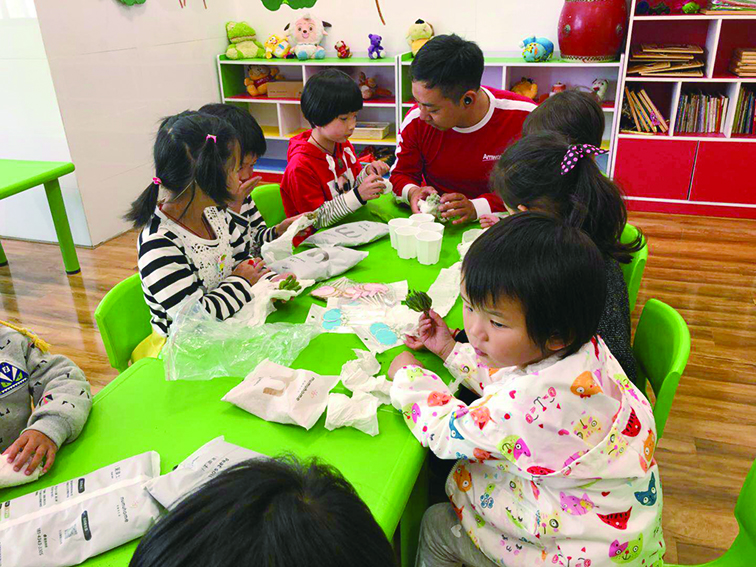 仪式结束后,志愿者们走进教室,与特教学校的学生们亲切交流、做游戏、制作小盆栽。特教学校的学生们用简单的手语动作表达了对他们的感谢之情,每一人的脸上都洋溢着开心的笑容。