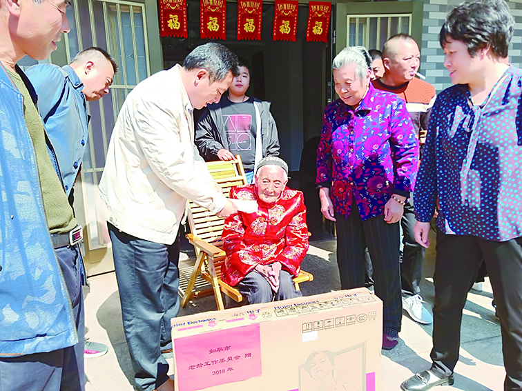 10月12日,如城街道新民社区16组郭有梅老人迎来了她的百岁寿辰。街道老年办张成玉等一行人在新民社区全体工作人员的陪同下来到百岁老人郭有梅家中为她庆寿,一同带来的还有市老年委赠送的电视机、街道老年办的慰问金以及新民社区慰问金。
