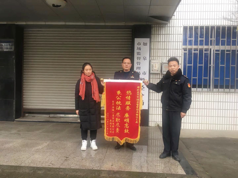 12月11日上午,南京金陵人家食品有限公司南通分公司的工作人员将一面印有“热情服务廉明高效秉公执法尽职尽责”的锦旗送到如皋市市场监督管理局搬经分局,感谢执法人员在处理举报过程中履职尽责,维护企业的合法权益不受损害。