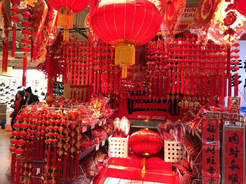 一进卖场,红彤彤的主通道,张灯结彩的布置氛围,年味十足,仪式感满满。糖果、饼干、巧克力、礼盒、年菜都上架了,品种丰富、种类齐全、陈列饱满,丰富的商品整齐地堆满了货架,各个通道里人头攒动,一片热闹景象。