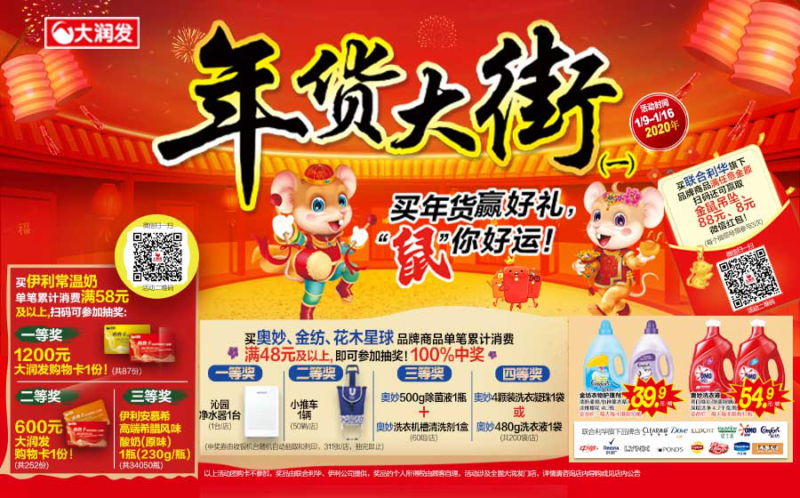 “年货大街”活动线上同步进行,价格与线下同享。大润发周边4000多万户居民可以使用手机,通过“大润发优鲜”APP、手机淘宝“淘鲜达”、“饿了么”APP在线逛大润发,坐享全球好货1小时送到家。