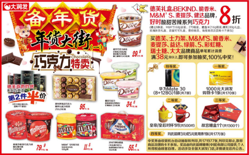 4)买玛氏旗下德芙、士力架、M&M’S、麦提莎等品牌商品满38元及以上即可参加抽奖,赢华为Mate30、1000元大润发购物卡、皇帝皇后对杯等奖品,100%中奖!