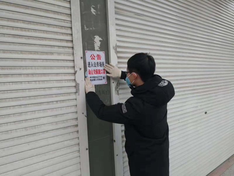 干警们沿街巡查店铺,宣讲疫情防控知识,并在显要位置张贴疫情防控标语。