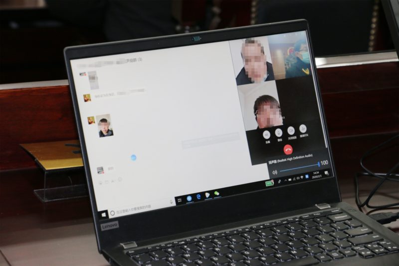 庭审开始前,章法官要求原、被告将本人的身份证拍照上传至微信群,在确认身份信息后,章法官开启微信群聊视频,敲响法槌,庭审正式开始,书记员同步记录。法庭调查、法庭辩论、最后陈述……所有流程依法有序进行,前后历时两个半小时完成了庭审。庭审结束后,对书记员同步记录的庭审笔录由法官、书记员签名后拍照至微信群聊,双方当事人进行确认。整个过程通过软件进行了录屏,并刻盘存卷。因双方争议较大,调解未果,本案将择日裁判。