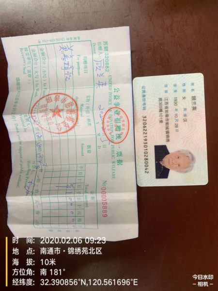 老人已90岁高龄,无收入无退休金,儿子还身患癌症,自身家庭困难。尽管这样,善良的顾兰英老人仍表示出一份绵薄之力,捐款1000元用于这次疫情防治。