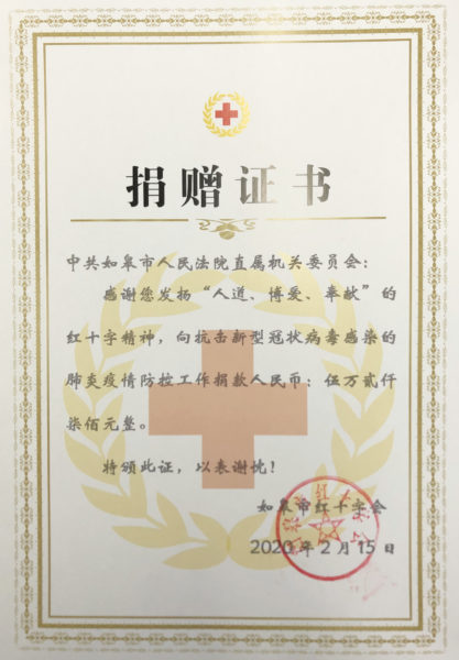 新如皋报讯 2020年2月15日上午,如皋法院直属机关党委书记顾雪红、副书记朱玉林将5万余元捐款交到如皋市红十字会,其中3万元定向用于武汉防疫,2万余元用于本市。