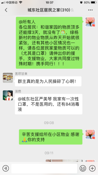 疫情当前,和谐家园小区业主自发开展互助自救。例如小区业主丁培是天禾大药房的老板,利用自己现有资源和条件,尽力购进1000双乳胶手套,第一时间免费赠送给小区物业人员和社区,解了社区防控装备的燃眉之急。口罩现在是人人必备的防疫用品,得知物业口罩供应不足,绿杨小区211-506、213-503业主不约而同捐赠口罩280只、55只,自发送到物业办公室等。居民们的善行之举,如涓涓细流,鼓舞和温暖着战“疫”一线的同志们,为抗击疫情注入了信心与力量。