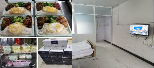 (上图为后勤人员为一线准备的工作餐和紧急改造的医学观察点的病房)
