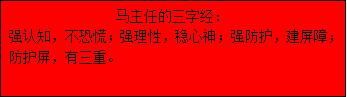 2020年阻击新冠肺炎的战争打响,医护人员斗志昂扬,英勇作战,门诊部主任兼感控科主任马小平说:“疫情就是命令,防控即是责任,要作战先得过感控这个关!”马小平主任是护理和感控的领头羊,是护理感控的军师,她说:“管理千万条,制度第一条,只有规范了制度,制定了流程,大家才有方向和准备,才会不慌乱,才能有条不紊的开展工作,我们感控科的职责是首先从源头上阻断传染源,保护患者和医护人员,努力确保医院的医护人员用正确的方法做好感染防控,全力保障不被感染,还要避免患者之间、患者和陪护之间、医护人员之间等发生交叉感染并全力杜绝扩散,为此我归纳为几个三字短语,姑且称它三字经吧!”马主任强调,新冠肺炎为乙类传染病按照甲类传染病管理,预防应摆在首位,她要求采取线上线下多模式的感染防控知识培训,要严格遵循流行病学三要素进行,也就是管理传染源、切断传播途径、保护易感人群,培训原则是:先普及共性,后针对个性化培训,为医护人员建立起三道防护屏障,即物防、技防、知识防护。(物防指口罩、帽子、隔离衣、护目镜、防护面具等。技防指正确使用防护品的能力,知识防护指科学全面的防护知识及积极的心理应对。)