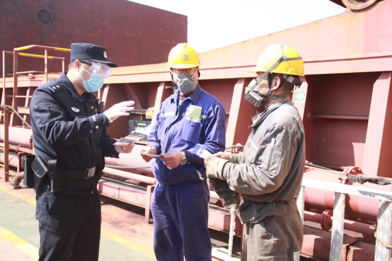 新型冠状肺炎爆发以来,如皋出入境边防检查站民警始终坚守抗疫一线,利用一线巡查、登轮检查等时机,对码头工人、船舶代理等复工企业员工开展疫情防控、安全生产和法律法规宣传教育,发放疫情防治知识手册,增强一线员工自我防护能力,进一步提升了国门卫士良好形象。