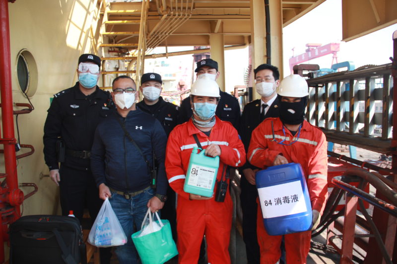 期间,防疫小组成员自发采购防疫物资,无偿赠送给防疫物资稀缺的在港外轮船员,同时向船员们发放中英文防疫宣传手册,指导船员调配消毒试剂,穿戴防疫护具,为船员们做了防疫知识的全面讲解,切实保障防疫工作落到实处,得到了船员们的一致好评。